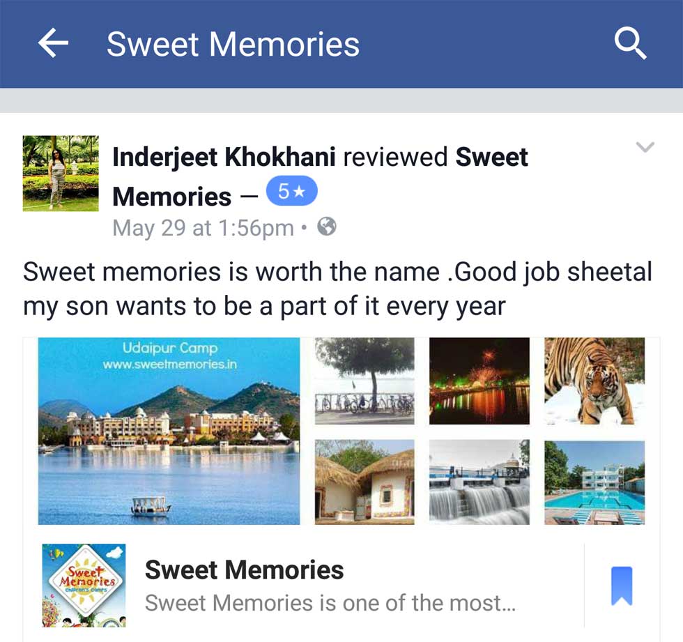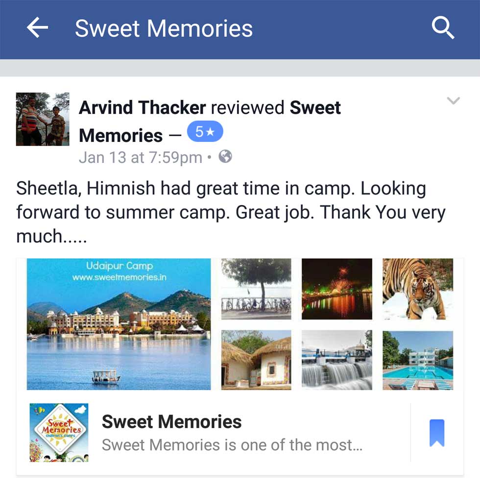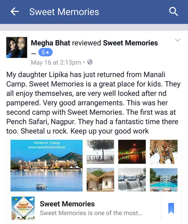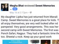 My son Ansh has attended the camp during Diwali at Yeoor organised by Sweet Memories.This camp was well organised. It took care of all the needs and requirements for our children. ie food, games, smooth travel and stay etc.The camp also was V. Safe from Parents point of view. Most Important, the Activities and Games Selected for Children, focussed the Overall Development of the Child, ie Physical & Cognitive e.g. Enhancing Memory; Visual-Motor Skills; Expressive and Communicative Skills; Confidence building and overall Personality Development.